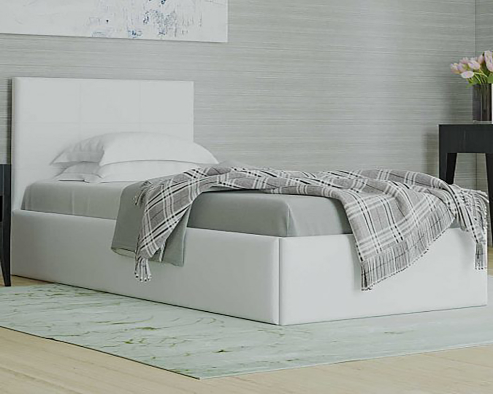 Նրբագեղ մահճակալ՝ դեկորատիվ կարով զարդարված գլխամասով։ Մոդելը պատրաստված է տախտակից։ Անկողնային պաստառագործություն՝ շքեղ էկո կաշվից։ Խնդրում ենք նկատի ունենալ, որ գլխամասի հակառակ կողմը ծածկված է spunbond-ով: Մոդելն ավելի մատչելի դարձնելու համար մահճակալի ներքևի հատվածը պատրաստված է բեժ սփունբոնդից։ Սա ապահովում է սենյակի հատակի ծածկույթի անվտանգությունը, ինչպես նաև անհրաժեշտության դեպքում հեշտացնում է մահճակալի տակի հատվածի փոշեկուլով մաքրումը: