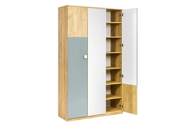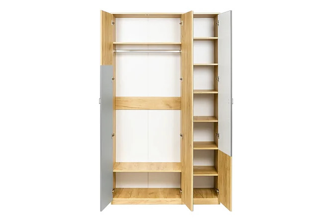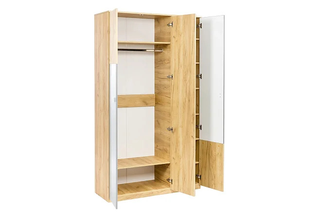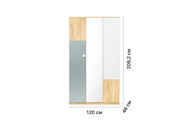 Կենտրոնական դռան հայելին թույլ է տալիս ամբողջ երկարությամբ տեսնել ձեր արտացոլանքը և միևնույն ժամանակ ծառայում է որպես տարածքի տեսողական ընդլայնում: Աջ և ձախ ճակատները լաքապատ գունավոր ներդիրներով կարելի է փոխարինել: