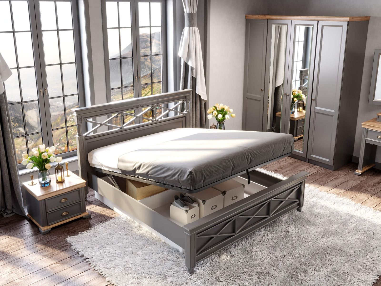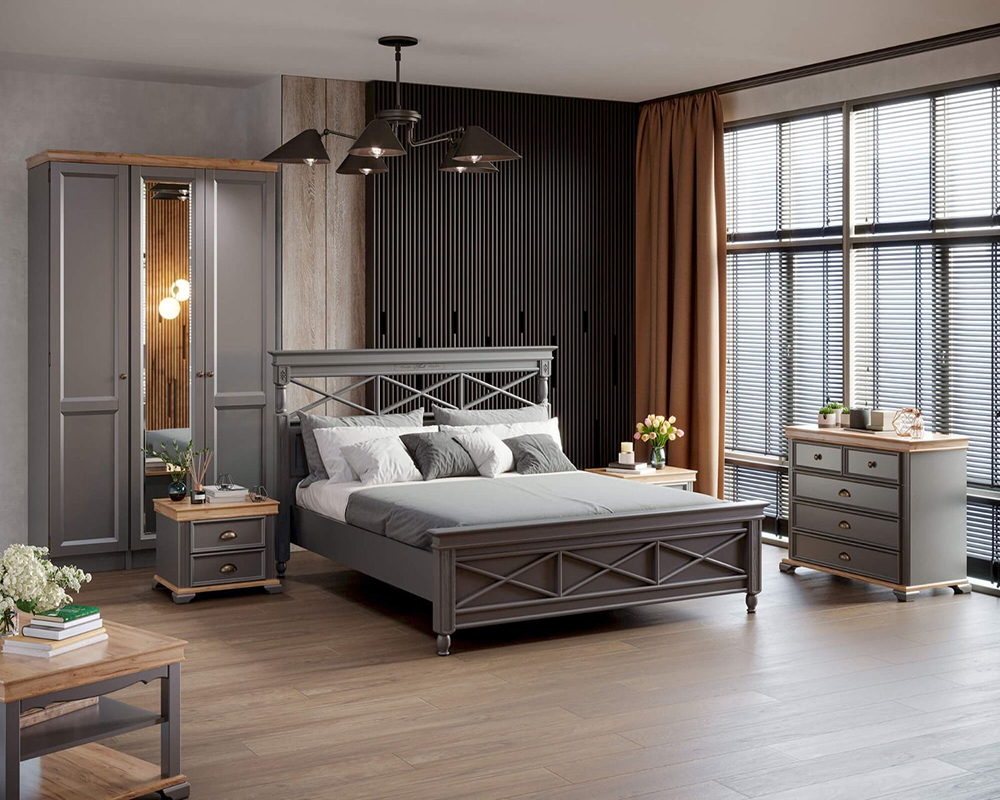 В комплект входит: кровать без ящика, МДФ и ЛДСП, ортопедическое основание, размер - 1840*2100*1200, шкаф-купе 3 двери - МДФ и ЛДСП, 2 закрытые двери, 1 дверь с зеркалом, 2 двери с вешалкой, 1 дверь с полкой, размер: 1350*612*2220, комод: 1000*460*810, Тумба: 560*460*480